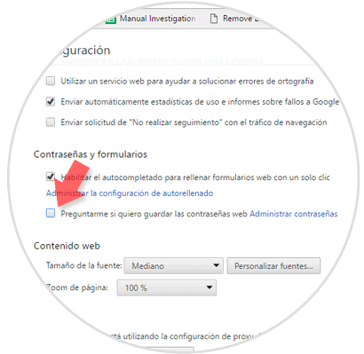 En la ventana desplegada pulsamos en la opción Mostrar configuración avanzada ubicada en la parte inferior y en la nueva ventana vamos al campo Contraseñas y formularios y allí desactivamos la casilla “Preguntarme si quiero guardar las contraseñas web”