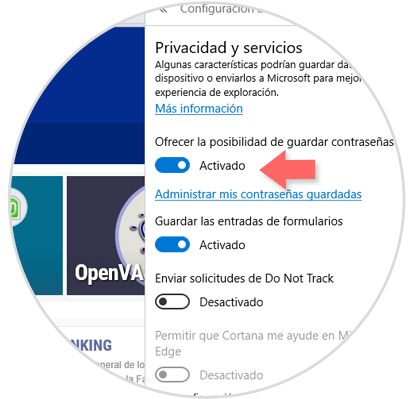 En la siguiente ventana damos clic en la opción Ver configuración avanzada ubicada en la parte inferior y allí, en el campo Privacidad y servicios, desactivamos el interruptor de Ofrecer la posibilidad de guardar contraseñas: