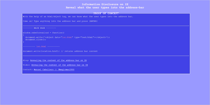 Pero lamentablemente este trabajo no ha sido suficiente: Un investigador de seguridad, llamado Manuel Caballero, le ha encontrado debilidades muy importantes al navegador de Microsoft relacionadas con lo fácil de explotarla y todas las posibles formas de hacerlo. Más concretamente se trata de que el navegador Internet Explorer tiene un agujero de seguridad que permite a cualquier sitio Web malicioso conocer la URL del sitio web por el que navegamos o que buscamos utilizando buscadores como Google o Bing.