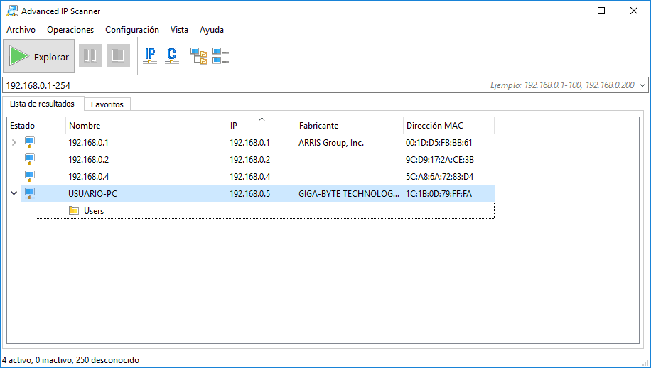 Al ejecutar la aplicación e indicar el rango de direcciones IP obtendremos el siguiente resultado:
