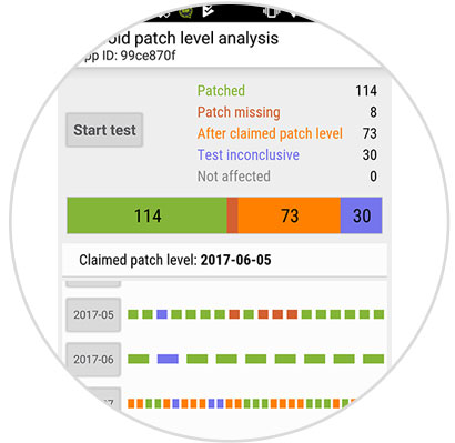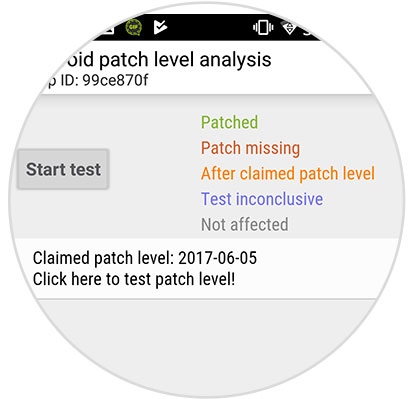 Para ello lo único que debemos hacer es instalarla en nuestro teléfono y seleccionar en la parte superior “click here to test patch level” – “start test”.