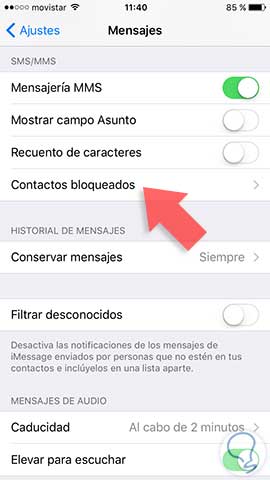 Igual que hemos visto en Android, en Apple también tenemos la posibilidad de bloquear los mensajes de aquellos contactos de los que no queremos recibirlos. Para ello dirígete a Ajustes > Mensajes y selecciona Contactos bloqueados.