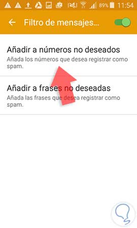 Activa el filtro y selecciona los números que quieres agregar a spam o no deseados. También puedes añadir frases que contengan esos mensajes.