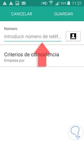 En la parte superior verás un +, presiona sobre él para añadir un nuevo número de teléfono o un criterio de coincidencia.