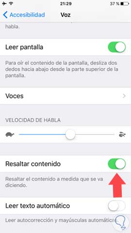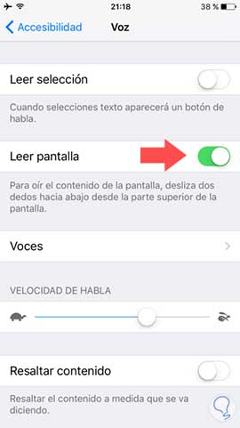 Volvemos a la pantalla de “Voz” y aquí vemos una opción en la que pone “VELOCIDAD DE HABLA”. Deslizamos el cursor hacia la izquierda o derecha en función de si queremos que nos hable más rápido o más despacio. También puedes ajustar la velocidad de habla cuando activas “Leer Pantalla” por lo que podemos dejar la que viene por defecto. Después, activamos la opción “Resaltar contenido”