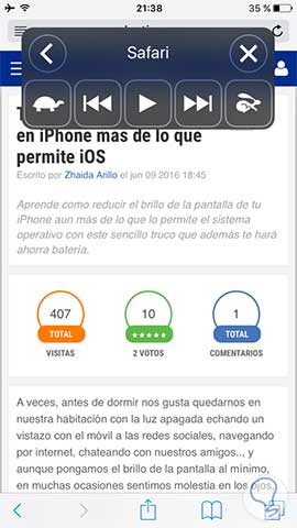 Ya tenemos activado “Leer Pantalla”. Ahora nos vamos a un artículo que queramos escuchar para que nos lo lea. Simplemente deslizamos con dos dedos hacia abajo desde la parte superior de la pantalla y nos aparece el siguiente panel de control, desde el cual podemos realizar una pausa, saltar hacia adelante o hacia atrás, y cambiar la velocidad de lectura (los botones de tortuga y conejo).
