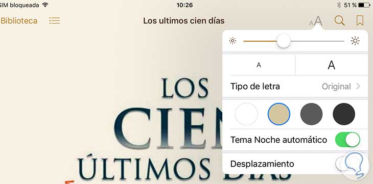 Una vez aqui se va a desplegar un menú en el que podemos ajustar el brillo, el tipo y tamaño de letra, el color de fondo, el tema noche automático y hasta si queremos tener activo el desplazamiento o no. De este modo vamos a tener la sensación de que el documento casi lo hemos diseñado nosotros mismos. Todos estos ajustes los podemos ir cambiando en función del momento en que nos encontremos y las circunstancias, ya que quizás necesitemos mas o menos luz en diferentes momentos o por ejemplo variar el tamaño de letra.