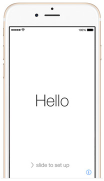 Vamos a tomar el teléfono y a continuación lo encendemos, para lo cual mantienes presionado el botón que se encuentra en la parte superior del iPhone hasta que aparezca la manzana (marca de Apple), una vez que esto ha aparecido verás que el iPhone presenta varios saludos en diferentes idiomas como se muestra en la imagen. Desliza la pantalla hacia la dirección que te indica.