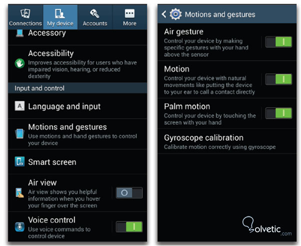Los ajustes para el control por sensores puede ser encontrado en Menu à Settings à My device. Para activarlos, navegamos por el listado de los mismos y deslizamos hacia la derecha para activar aquel que deseemos.