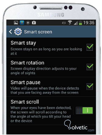 - Smart rotation: Con esta funcionalidad la cámara frontal detecta la orientación de nuestra cara y rota la pantalla de acuerda a esta, así que sí movemos nuestra cabeza a los lados la pantalla se adaptara.