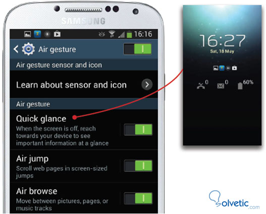 - Quick glance: Acostamos el teléfono en alguna superficie fija y cuando este en modo standby (pantalla negra) movemos nuestra mano por encima del sensor para desplegar información de estatus incluyendo llamadas perdidas, mensajes y nivel de la batería.