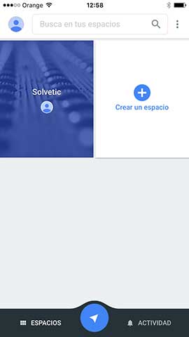 Una vez que la tenemos descargada en nuestro teléfono,podemos comenzar con la configuración. Lo primero de todo es tener una cuenta de Gmail, apara poder asociarla y poder utilizar la app. Una vez realizado este paso, vamos a encontrar en su pantalla principal la posibilidad de crear un espacio o acceder a uno ya creado.