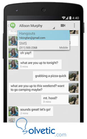 Ahora no tendrás los mensajes de un mismo contacto desperdigados, gracias a las novedades da igual que te envíen un SMS o un MMS, pues todos quedarán reunidos en la aplicación Hangouts junto con las conversaciones y llamadas de video que realices. Además te permite enviar animaciones GIF y compartir tu localización como haces con WhatsApp.