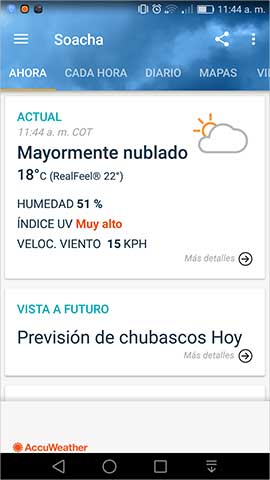Una de las aplicaciones más conocidas, dinámicas y totalmente precisas para dispositivos Android es AccuWeather la cual goza de un gran prestigio internacional. AccuWeather actualiza su información del clima de forma constante permitiéndonos estar seguros que toda la información desplegada es precisa y verídica.