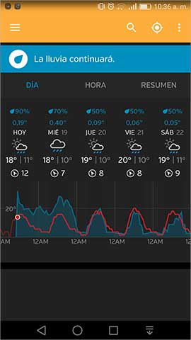 Desarrollada por Earth Networks, esta aplicación promete ser una de las aplicaciones más sobresalientes al obtener el premio Best Weather App en el año 2016 lo cual nos garantiza tener la certeza de la información en tiempo real. Con esta aplicación contamos con la posibilidad de saber al momento las condiciones meteorológicas, las previsiones precisas y todo lo relacionado con el clima las 24 horas.