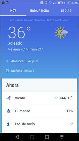 Esta herramienta integrada en Android por defecto nos brinda la posibilidad de conocer en tiempo real el estado del clima tomando como base la ubicación por GPS del dispositivo. Basta con abrir la aplicación e ingresar, o decir, clima para que de forma automática sea desplegada la información correspondiente. Allí podemos pulsar en el botón inferior para tener información mucho más detallada del clima: