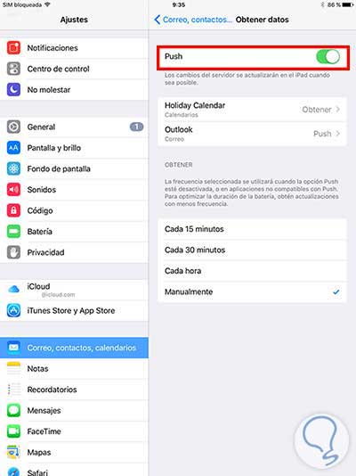 En el caso de que queramos desactivar este tipo de configuración, tendríamos que dirigirnos a “Mail, contactos, calendarios” y en la configuración “Obtener datos”. Desde aquí quitamos la opción de “Push”.