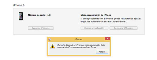En la pantalla de iTunes va a aparecer un mensaje el cual nos indica que ha encontrado un iPhone en “Modo recuperación”. Tenemos que seleccionar aceptar, y el dispositivo comenzará a restaurarse. Una vez que la restauración ha sido terminado ya tendremos nuestro teléfono como recién salido de la fábrica. Lo siguiente que debemos hacer es restaurar nuestra copia de seguridad como ya hemos explicado, para poder volver a recuperar todos nuestros datos.