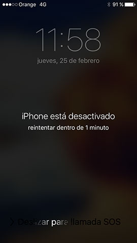 Si hemos introducido un código erróneo durante seis intentos, nuestro iPhone se verá inevitablemente bloqueado. Será el propio teléfono el que nos informe de lo ocurrido mediante un mensaje en el que pondrá “El iPhone esta desactivado, inténtelo de nuevo en 1 minuto”