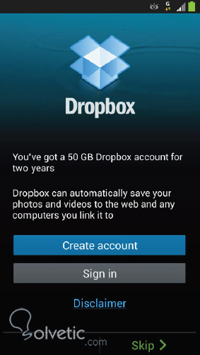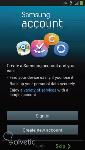 - En este paso los usuarios que posean una cuenta de Samsung pueden iniciar sesión acá o en caso contrario crear una nueva. Esta cuenta es necesaria para utilizar muchas de las funcionalidades de Samsung. Podemos saltarnos este paso tocando el botón Skip.