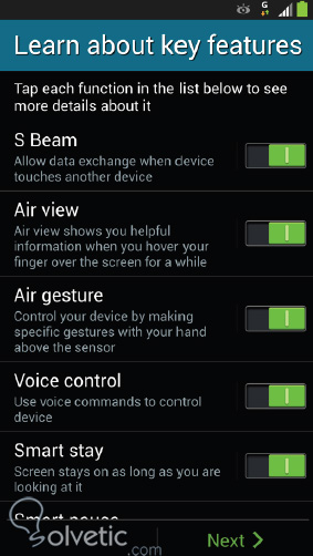 - Si posees tiempo suficiente, en el siguiente paso podrás aprender algunas funciones llamativas del S4, tales como gestos, control por voz, entre otras. Puedes activar o desactivar cada función deslizando el botón verde de derecha a izquierda y viceversa. Este paso también puede ser saltado.