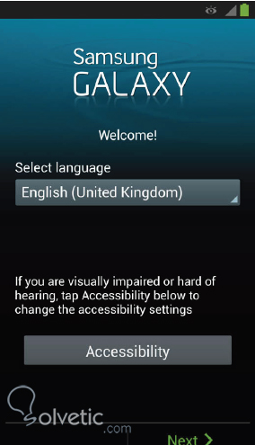 - Primero que nada seleccionamos el lenguaje que deseamos sea usado en todos los menús del teléfono. Sí tienes alguna dificultad visual o algún problema de escucha puedes cambiar la configuración desde el botón de Accessibility. Luego toca Next.