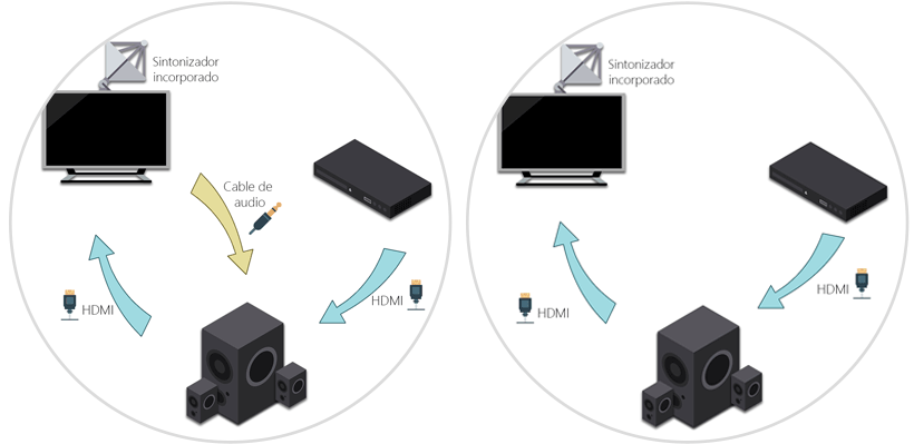 Para usar de la forma correcta HDMI ARC tanto nuestro televisor como el sistema de teatro deberán ser compatibles con la conexión HDMI ARC y para ello debemos comprobar que en la parte trasera del dispositivo este la leyenda HDMI OUT/HDMI OUR (ARC) o HDMI IN/HDMI IN (ARC). En la imagen podemos ver el antes y el después de usar conexión HDMI ARC, el cable de sonido no es necesario.