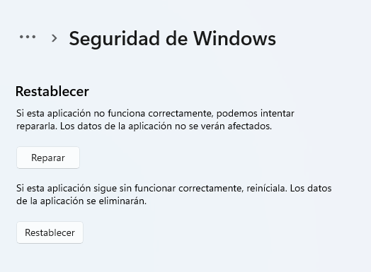 Hola que tal, te dejo esta opción porque es la mejor que puedo enseñarte y te digo que te lo va a solucionar si no te va bien Seguridad de Windows. Porque desde aqui puedes restablecerlo etc.