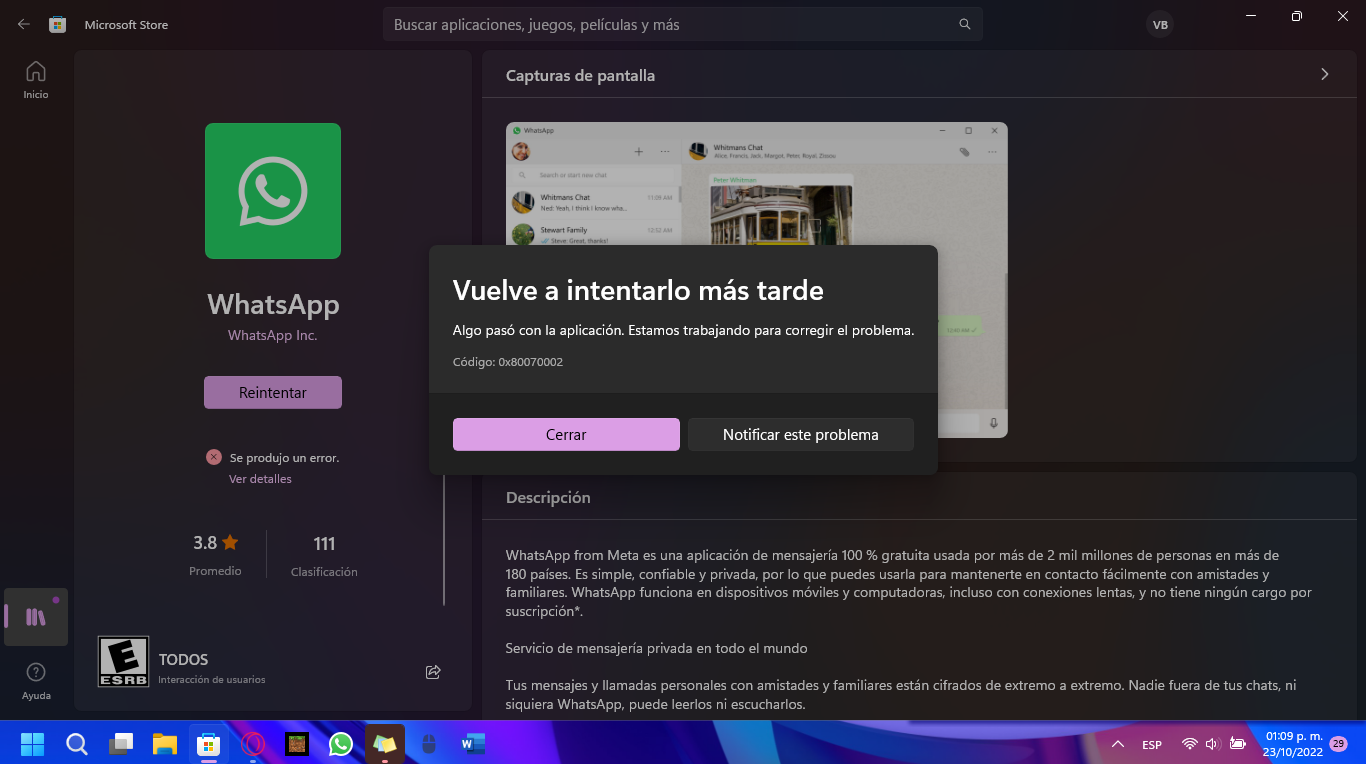Al intentar instalar/actualizar cualquier aplicacion en Microsoft Store aparece "Hubo un problema de nuestro lado", 0x80070002
