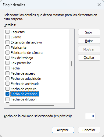 En la ventana que aparece, desplázate hacia abajo y selecciona 'Fecha de creación'. Luego, presiona 'OK'.