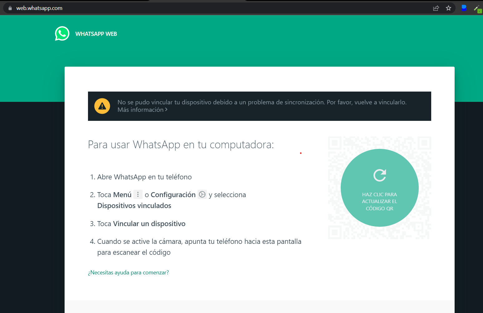 No se pudo vincular tu dispositivo debido a un problema de sincronización. Por favor, vuelve a vincularlo. Mas informacion