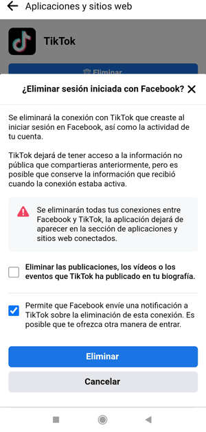 A la hora de desvincular tu cuenta puedes elegir si quieres que se borren todas las publicaciones, vídeos o eventos que TikTok haya publicado en tu biografía de Facebook