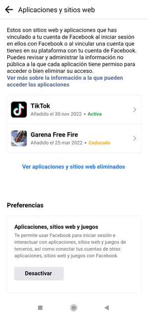 5) Aquí, cuando tienes TikTok vinculado con FB, encontraremos esta opción. Selecciona sobre TikTok y pulsa en “Eliminar”.