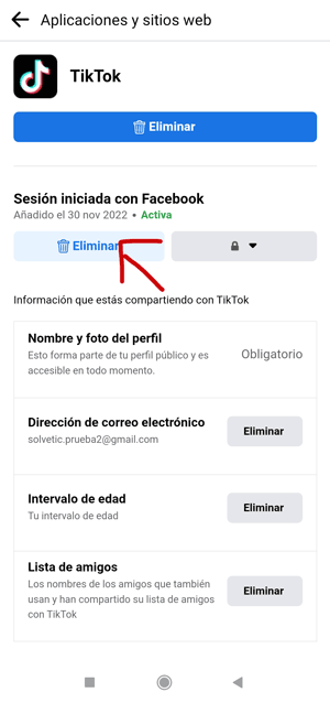 • Después aquí confirma quitarle los permisos si pulsas en “Eliminar” dentro de “Sesión iniciada con Facebook”