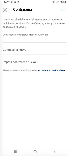 5) Ahora, por seguridad, Instagram te va a pedir que metas la contraseña antigua y 2 veces la nueva contraseña. Hazlo y comprueba si el problema continúa.