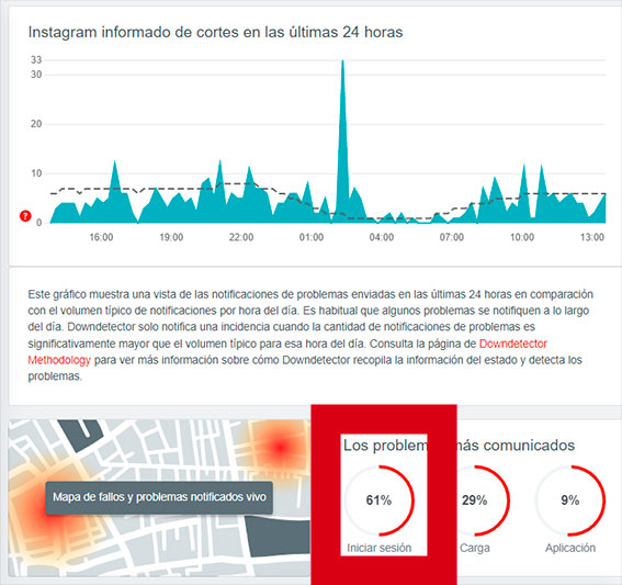 En la parte inferior vas a ver unos porcentajes con los fallos más reportados, y hay uno que es “Inicio de sesión”. Si hay un alto porcentaje aquí, indica que hay más personas como tu afectadas por esto por lo que no seria raro que en unas horas Instagram lo solucionará automáticamente.