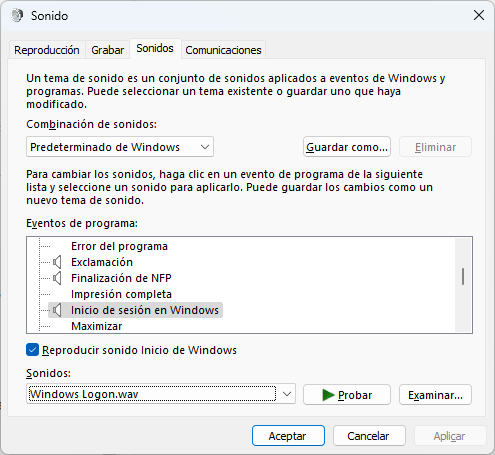 5) Ahora puedes desplegar los sonidos que hay darle a probar, elegir el que quieres para esto y darle a aplicar y aceptar, o bien puedes darle a examinar y subir el sonido que quieres que suene al iniciar sesion.