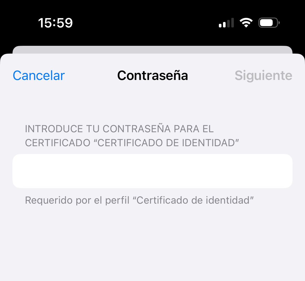 7) Ahora si te pide que pongas la contraseña de tu Certificado para terminarlo de instalar en tu iPhone. Pon la contraseña del Cert y le das a SIGUIENTE que te sale arriba a la derecha como ves en este pantallazo que te he hecho: