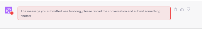 Creo que el límite en caracteres que tiene ChatGPT 4 es de hasta 25.000 caracteres. El GPT-4 "normal" de ChatGPT Plus permite limite de 8.192 tokens, lo que vienen a ser 6.144 palabras en el prompt que es lo que imagino os interesa conocer. Si os pasais de limites aparecerá una imagen como esta, lo digo porque tengo ChatGPT4.