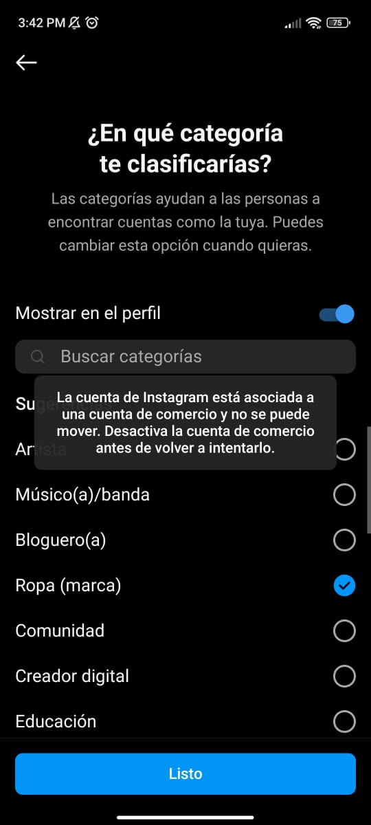 Buenas. Te sale este error en Instagram: La cuenta de Instagram está asociada a una cuenta de comercio y no se puede mover. Desactiva la cuenta de comercio antes de volver a intentarlo.