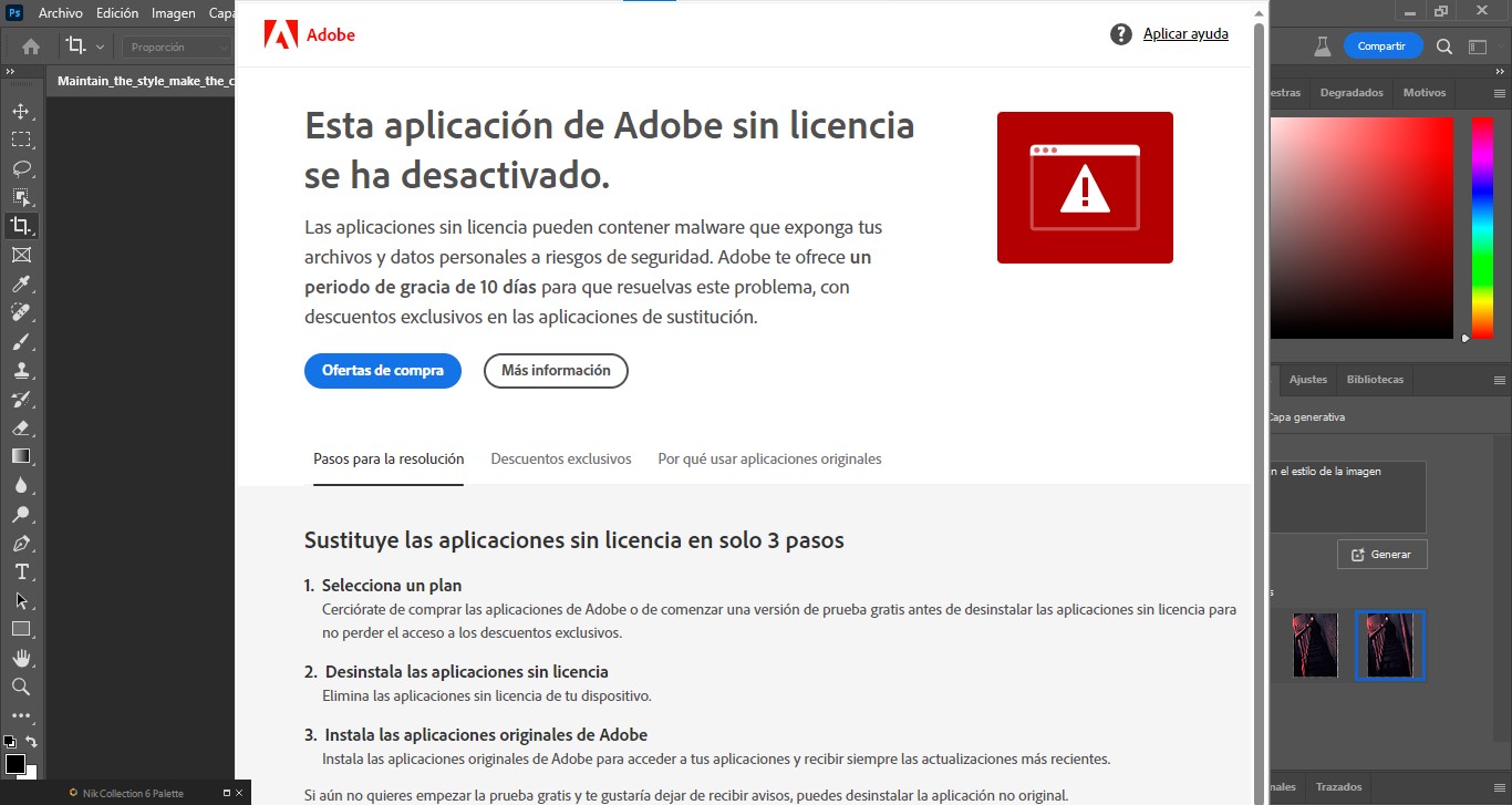 Ante todo, un saludo a toda la comunidad. Quería exponer una inquietud que tengo frente a la nueva versión 24.7 de Photoshop, la cual trae el relleno generativo y otras funciones de IA que resultan muy útiles para todos los que trabajamos en este programa. Soy estudiante y me es imposible costear la suscripción de Adobe; la universidad tampoco hace algo al respecto, por lo que me veo en la obligación de buscar programas piratas, como muchos otros. Intentando usar las funciones de IA, salta el pop-up de que esta aplicación sin licencia se ha desactivado. Si bien este desaparece usando el firewall de Windows, también se bloquean las funciones de IA, ya que estas requieren algún tipo de conexión a internet. Así me encuentro en este círculo vicioso de no poder usar las funciones de IA, o si quiero usarlas, sale el pop-up que cierra el programa inmediatamente después de quitarlo. Busco alguna manera de quitar este pop-up sin que el programa se cierre, o cualquier tipo de solución con la que pueda usar las funciones de IA.