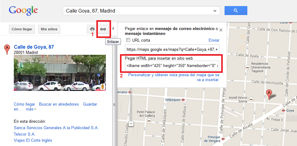 Por último una vez te logues con tu cuenta de Gmail verás que puedes pulsar (una vez busques una ubicación del restaurante o sitio que quieras) en el icono de enlace y luego copiar TODO el código que te pongo en el recuadro2.