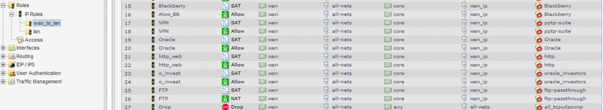 Tienes que crear 2 carpetas (esto es opcional pero lo recomiendo para tenerlo ordenado) Una sería NAT o Lan (Pondrás las reglas de dentro hacia fuera de la LAN) y otra que yo llamo WAN (Para las reglas de permiso o denegación desde fuera hacia dentro de tu red.)