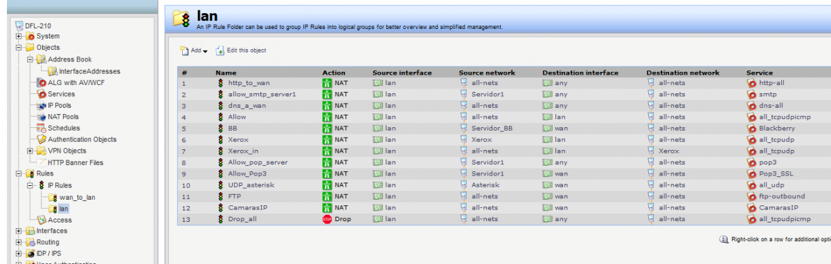Buen dia estoy usando el mismo dispositivo d link dfl 210 , quisiera saber como crear una regla de entrada a un servidor de aplicaciones web, trabajo en desarrollo de aplicaciones, y tengo ip publica la cual debe ingresar a un servidor de aplicaciones, las cuales tienen unos paths, unas rutas, ejemplo, 192.168.0.54/nombreaplicacionRuta1, 192.168.0.54/nombreaplicacionRuta2, cabe resaltar que se pueden publicar n aplicaicones en el servidor, lo cual da varias rutas. quisiera saber como crear esta regla wan _ to lan espero que me puedan colaborar