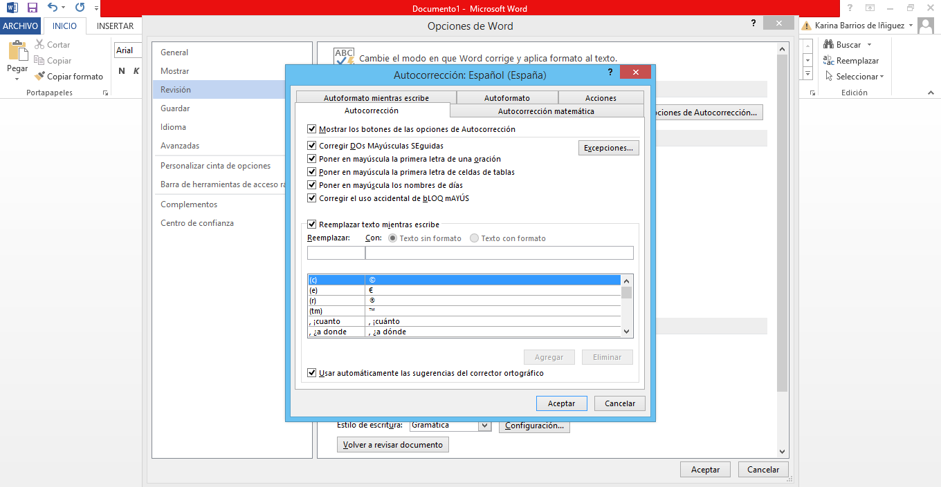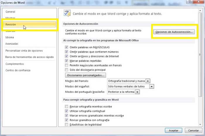 Ahora tienes que seleccionar en el lateral la opción de “Opciones de autocorrección” desde la pestaña de “Revisión”