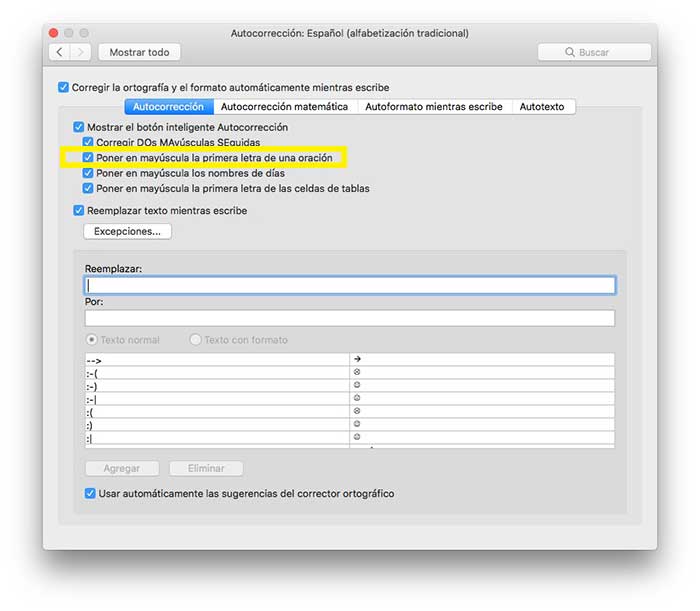 Una vez aquí, vas a ver un montón de opciones. Tienes que seleccionar “Poner mayúscula la primera letra de una oración”