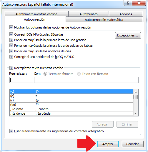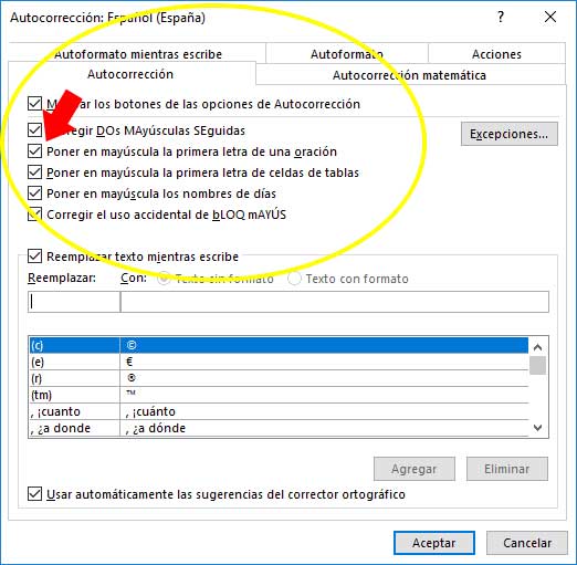 Ahora vas a ver una serie de opciones que puedes ir configurando en función de aquello que te interese. En este caso tienes que seleccionar la casilla de “Poner mayúscula la primera letra de una oración”
