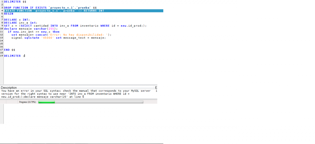 :create trigger trigger_prueba before insert on inventario for each row begin DECLARE x INT; DECLARE inv_a int; SET x = (SELECT cantidad INTO inv_a FROM inventario WHERE id = new.id_prod;); declare mensaje varchar(255); if new.inv_ant >= new.x then set mensaje= concat('Error: No hay disponibilidad: '); signal sqlstate '45000' set message_text = mensaje; end if; end