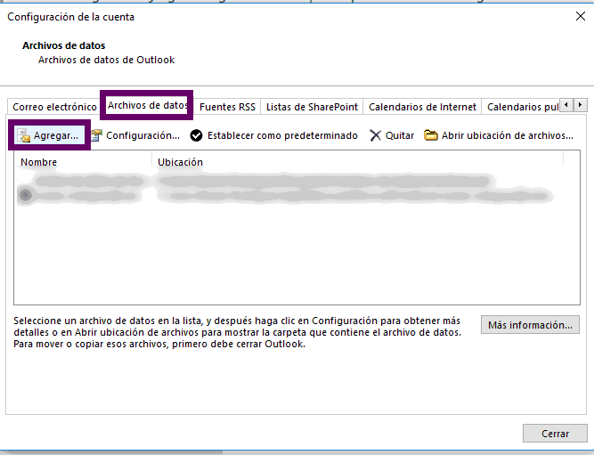 Ahora verás una nueva pestaña. En esta ocasión tienes que seleccionar la pestaña de ARCHIVO DE DATOS y seleccionar la opción de AGREGAR para crear esta nueva carpeta.