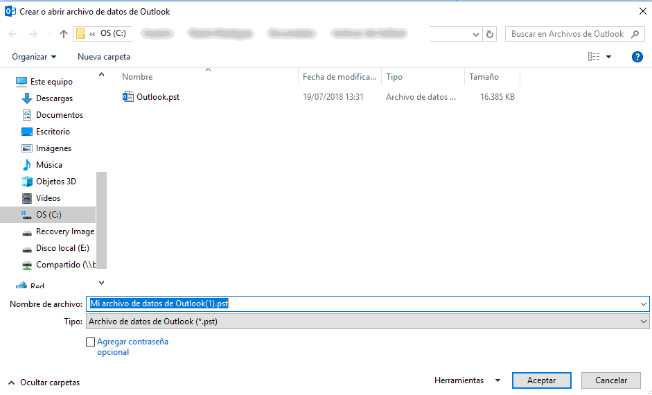 De esta forma vas a poder crear un archivo contenedor .pst de carpetas personales nuevo. Espero que te haya servido.